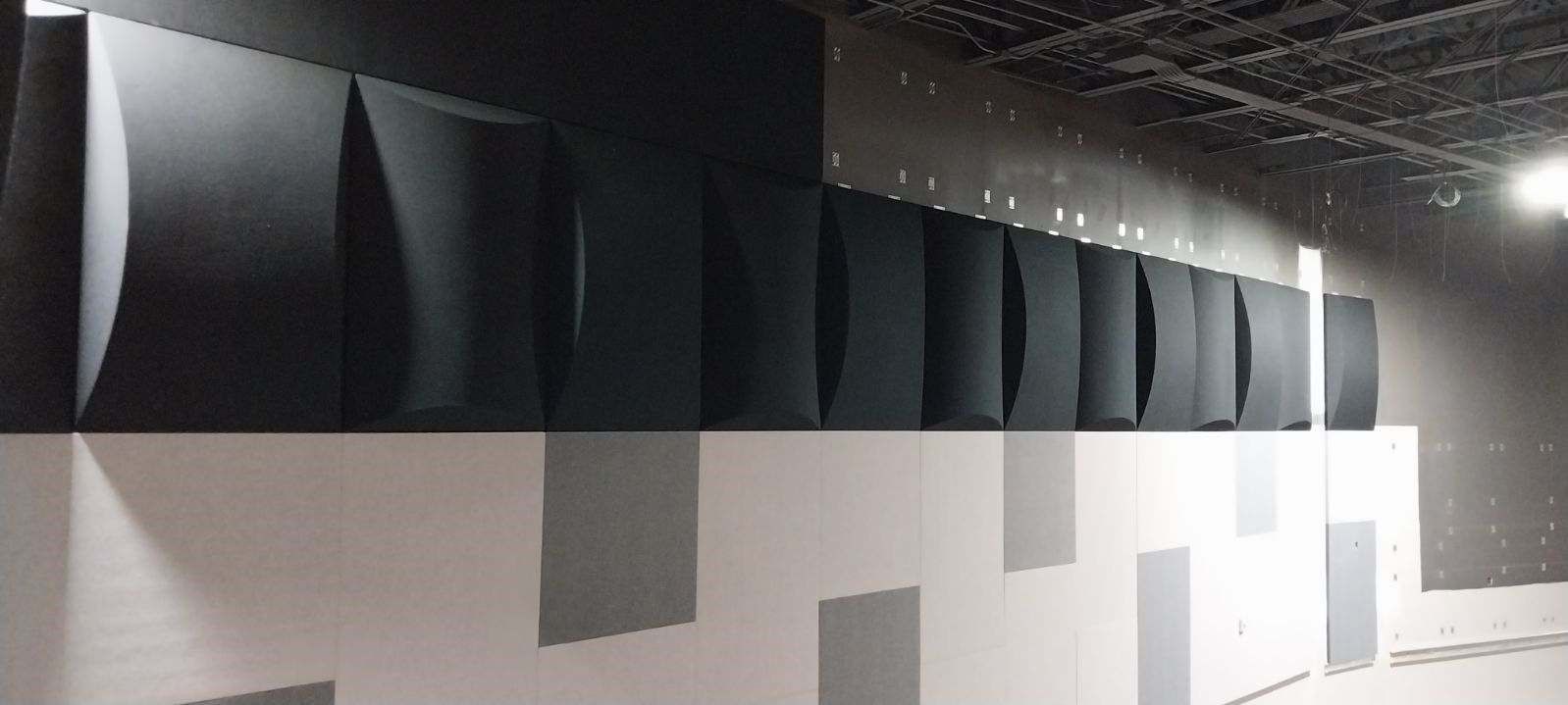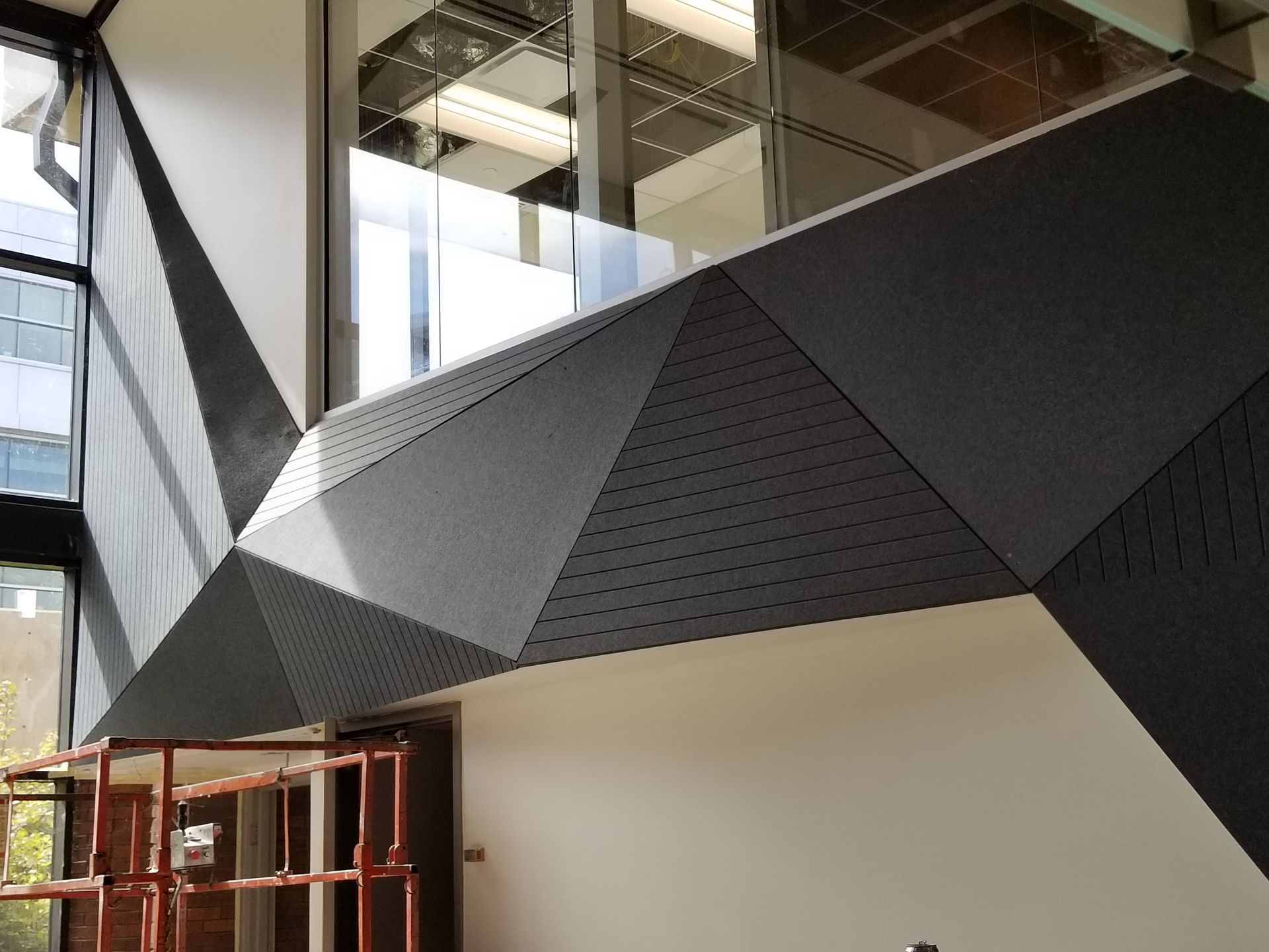A room with a lot of triangles on the ceiling
